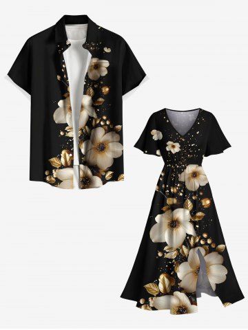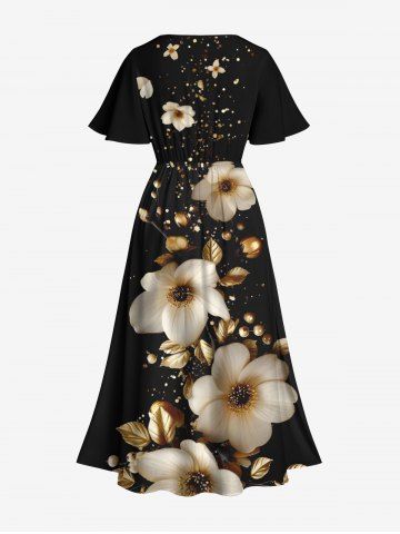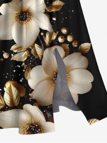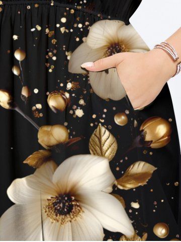 Robe midi trapèze grande taille à imprimé floral doré et feuilles hawaïennes, poches fendues. - Noir - Noir