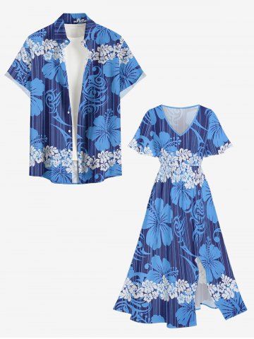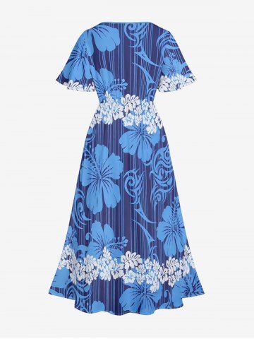 Robe midi trapèze grande taille à imprimé floral tropical et hibiscus, style hawaïen, avec poches fendues - Bleu - Bleu