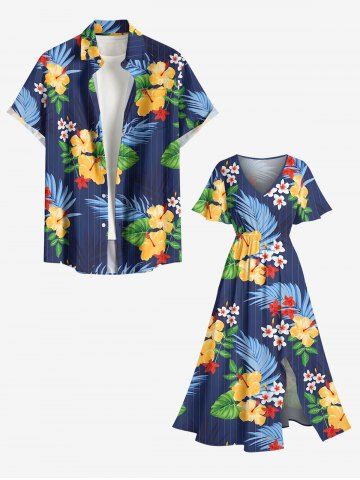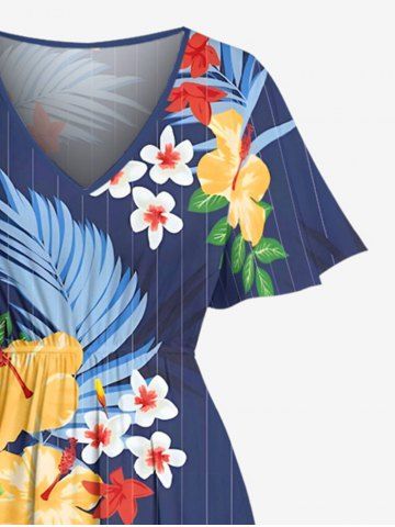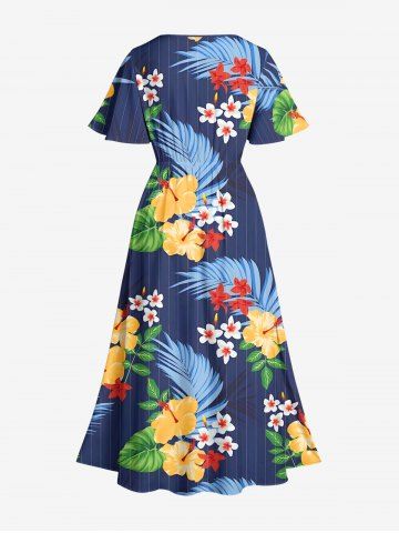 Robe midi trapèze grande taille à imprimé floral tropical et hibiscus, style hawaïen, avec poches fendues - Cadetblue - S