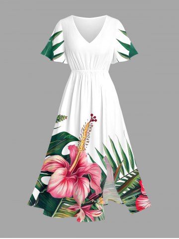 Robe midi trapèze grande taille à imprimé floral tropical et hibiscus, style hawaïen, avec poches fendues - Blanc - Blanc