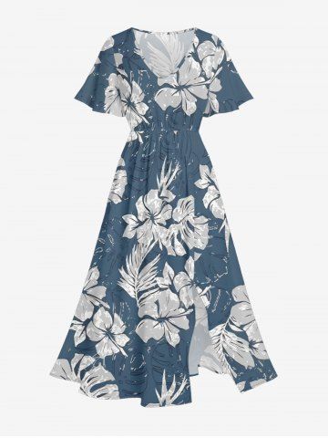 Robe midi trapèze grande taille à imprimé floral tropical et hibiscus, style hawaïen, avec poches fendues - Bleu Profond - S