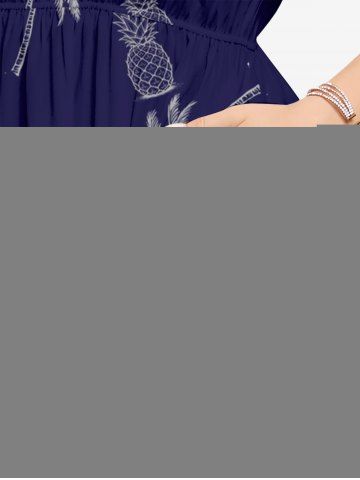 Robe midi trapèze grande taille à imprimé guitare et cocotiers, ananas et guitare, style hawaïen, avec poches fendues - Bleu Profond - Xs