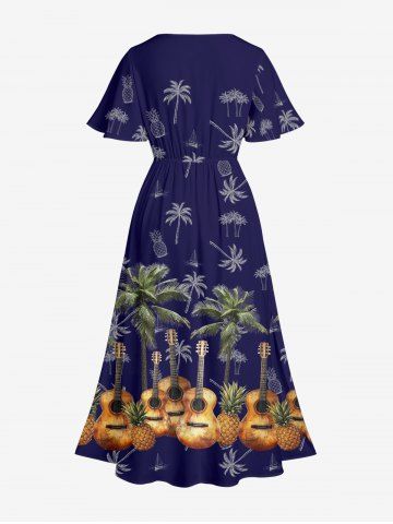 Robe midi trapèze grande taille à imprimé guitare et cocotiers, ananas et guitare, style hawaïen, avec poches fendues - Bleu Profond - M