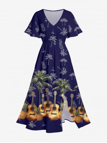 Robe midi trapèze grande taille à imprimé guitare et cocotiers, ananas et guitare, style hawaïen, avec poches fendues - Bleu Profond - 3x