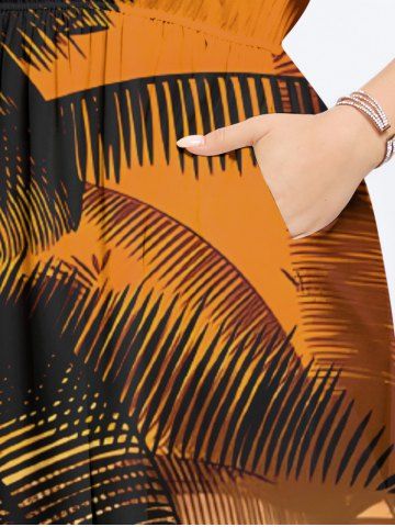 Robe midi trapèze grande taille à imprimé hawaïen, cocotier et ciel ombré, poche fendue, style hawaïen - Orange Foncé - 4x