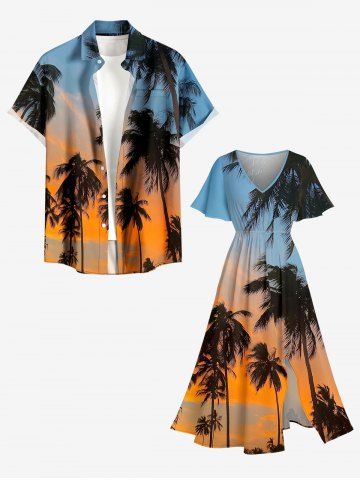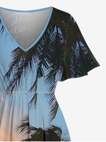 Robe midi trapèze grande taille à imprimé hawaïen ombré ciel crépusculaire et cocotiers, poche fendue - Bleu Ciel - Bleu Ciel