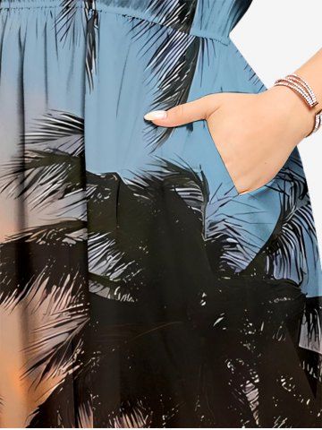 Robe midi trapèze grande taille à imprimé hawaïen ombré ciel crépusculaire et cocotiers, poches fendues - Bleu Ciel - Bleu Ciel