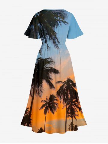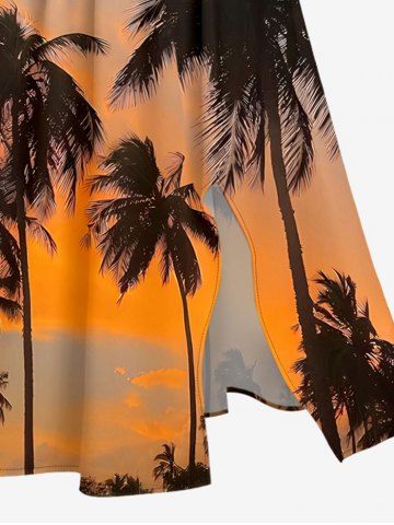 Robes Graphiques > Robe midi trapèze grande taille à imprimé hawaïen ombré ciel crépusculaire et cocotiers, poches fendues