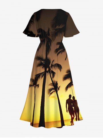 Robe midi trapèze grande taille à imprimé ombré crépusculaire, style hawaïen, avec poches fendues et cocotiers. - Jaune - Jaune