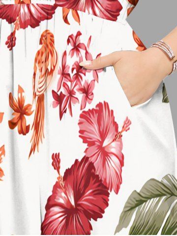 Robe midi trapèze grande taille à imprimé perroquet, cocotiers et hibiscus, fleurs d'hibiscus, style hawaïen, avec poches fendues - Rose Clair - Rose Léger
