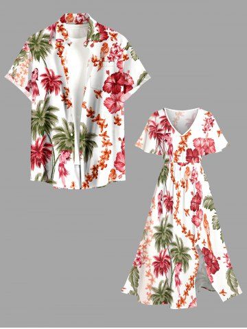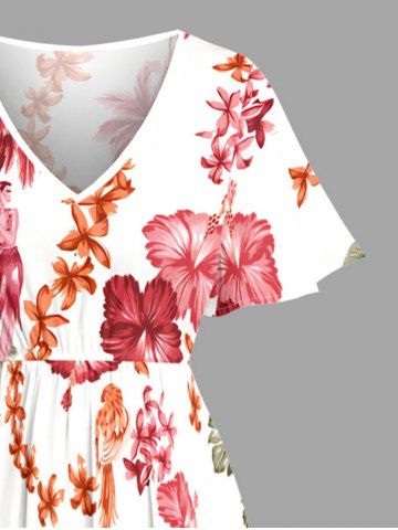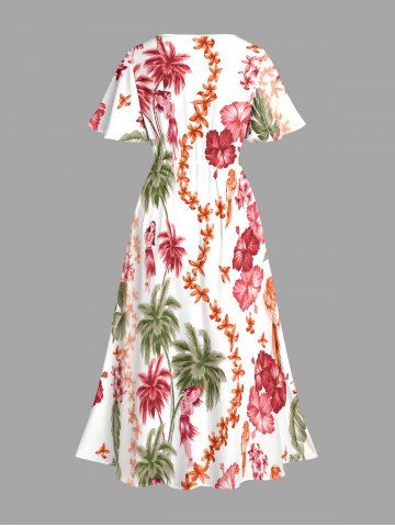 Robe midi trapèze grande taille à imprimé perroquet, cocotiers et hibiscus, fleurs d'hibiscus, style hawaïen, avec poches fendues - Rose Clair - Rose Léger