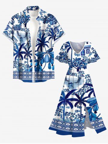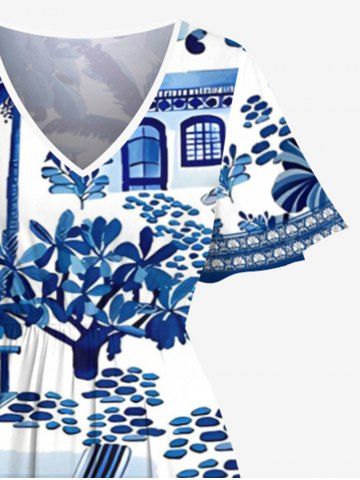 Robes Graphiques > Robe midi trapèze grande taille à imprimé porcelaine bleue et blanche style hawaïenne, motif chemin de cocotiers, bleu et blanc