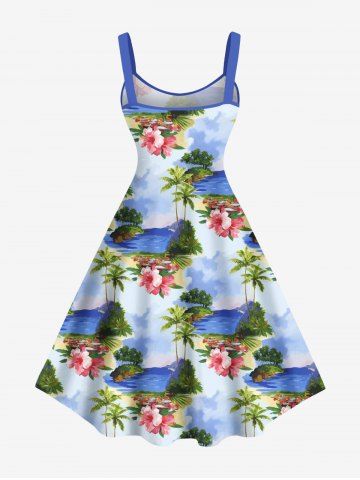Robe Paysage de Plage Ligne A Fleur et Arbre Noix de Coco Imprimés de Grande Taille - Bleu Clair - Bleu Clair
