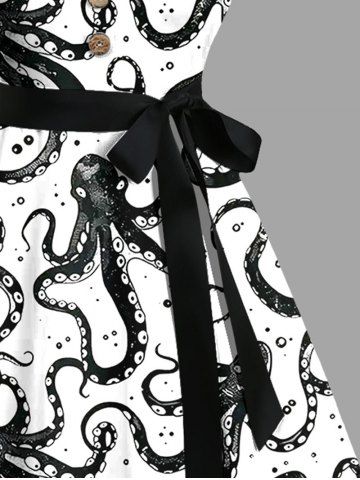 Robes Graphiques > Robe Pieuvre Imprimée Bicolore avec Boutons de Grande Taille à Col Relevé
