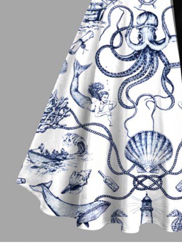 Robe Pin-up Ceinturée Coquillage Pieuvre et Requin Imprimés de Grande Taille - Blanc - Blanc
