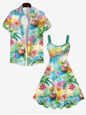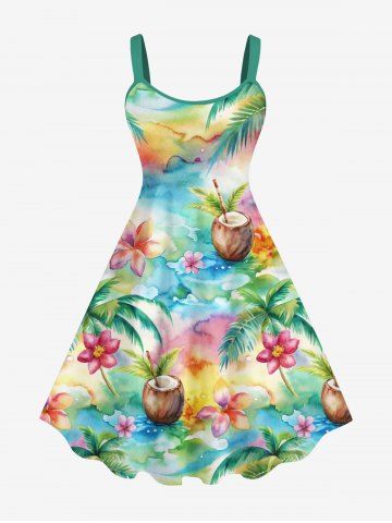 Robes Graphiques > Robe débardeur grande taille à imprimé floral de cocotier, aquarelle colorée, dos nu, coupe trapèze, style hawaïen