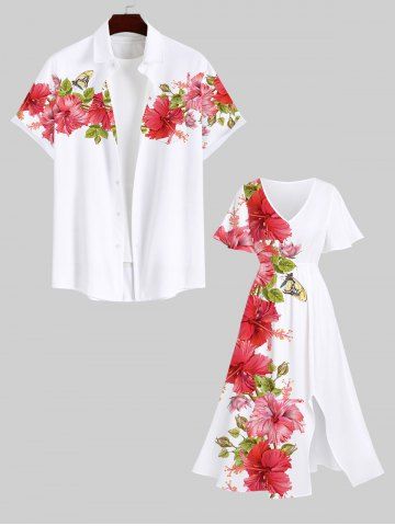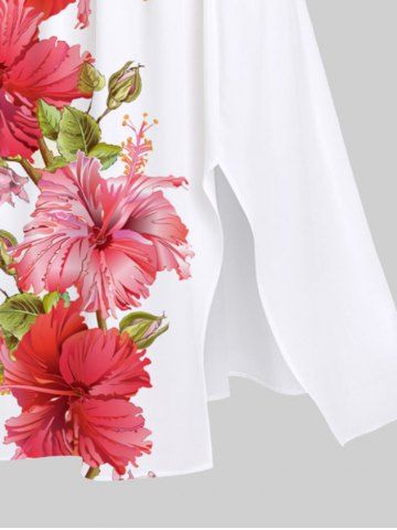 Robe Portable Mi-Longue Fendue Fleur D'Hibiscus et Papillon Imprimés de Grande Taille - Blanc - Blanc
