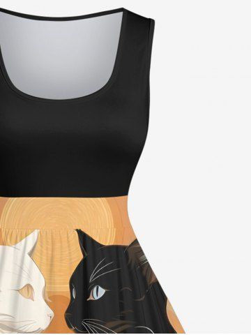 Robe Trapèze Deux-Tons à Imprimé Chats et Vagues Grande-Taille - Noir - Noir