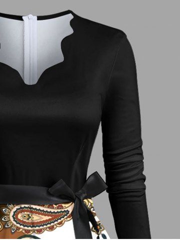 Robes Graphiques > Robe trapèze grande taille à imprimé géométrique cachemire et colorblock hawaïen, col festonné et ceinture amovible