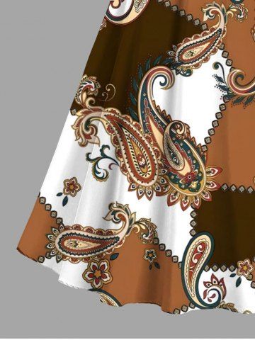 Robe trapèze grande taille à imprimé géométrique cachemire et colorblock hawaïen, col festonné et ceinture amovible - Brun - Brun