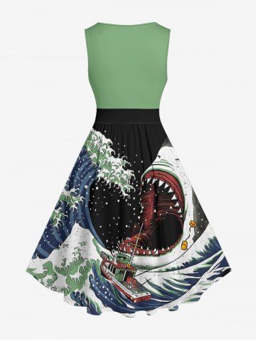Robes Graphiques > Robe trapèze grande taille à imprimé requins, vagues et voiliers, style hawaïen