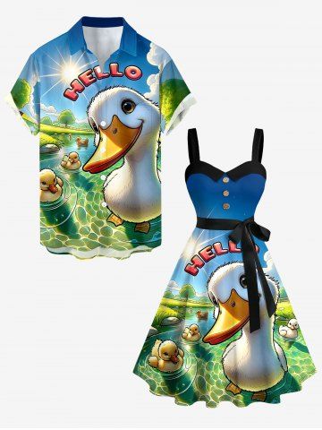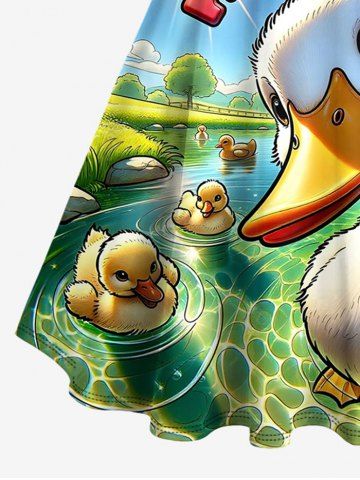 Robes Graphiques > Robe trapèze grande taille à imprimé soleil et canards mignons, style hawaïen, boutonnée et avec ceinture amovible