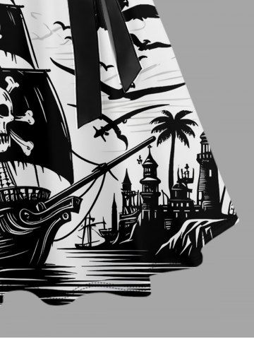 Robes Graphiques > Robe trapèze grande taille à imprimé tête de mort, pirate, voilier et oiseaux, style croisière hawaïenne, avec ceinture amovible