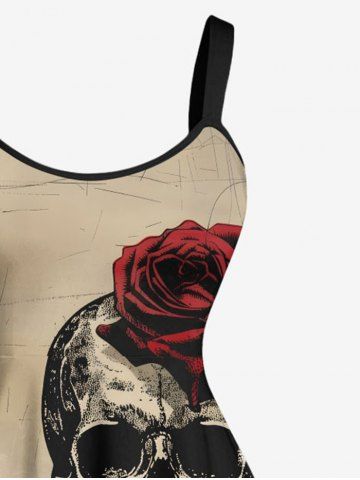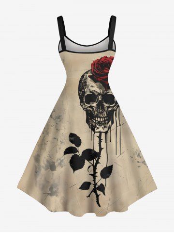 Robes Graphiques > Robe trapèze grande taille à imprimé tête de mort, rose, fleur et feuille pour Halloween