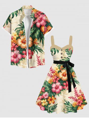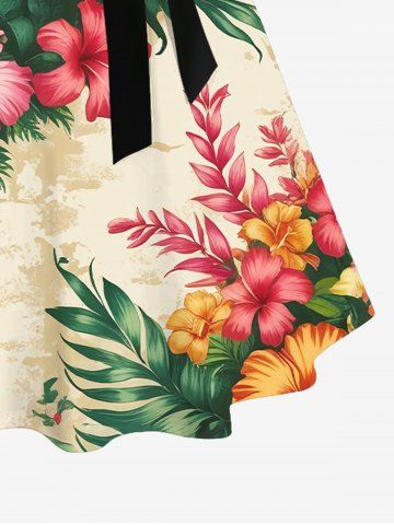 Robes Graphiques > Robe trapèze grande taille à imprimé tropical de feuilles et d'hibiscus, style hawaïen, boutonnée et avec ceinture amovible