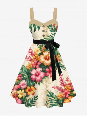 Robes Graphiques > Robe trapèze grande taille à imprimé tropical de feuilles et d'hibiscus, style hawaïen, boutonnée et avec ceinture amovible