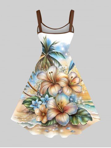 Robes Graphiques > Robe trapèze grande taille à imprimé tropical feuille de cocotier pailletée et fleurs d'hibiscus, style hawaïen