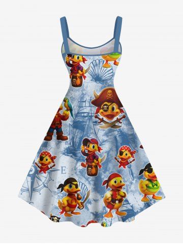 Robe trapèze grande taille imprimée canard pirate voilier coquillage perroquet croisière hawaïenne - Bleu Poudre - 1x