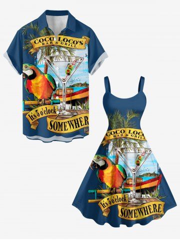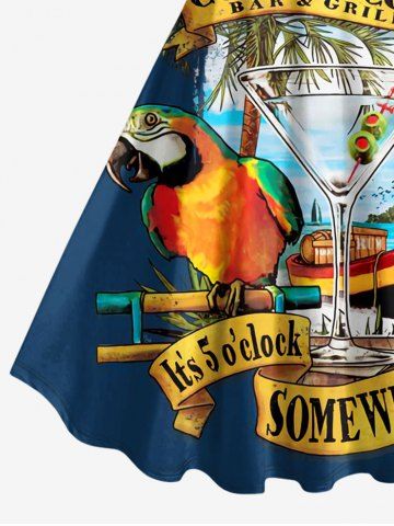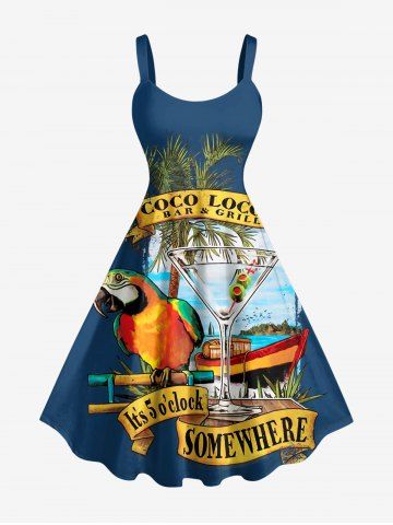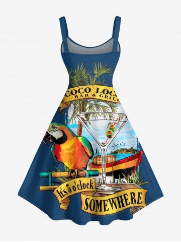 Robe trapèze grande taille imprimée cocotier et perroquet paysage marin hawaïenne - Bleu Profond - S
