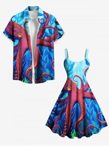 Robe trapèze hawaïenne à imprimé ombré de plantes pieuvres et de fonds marins, grande taille - Bleu Ciel - Bleu Ciel