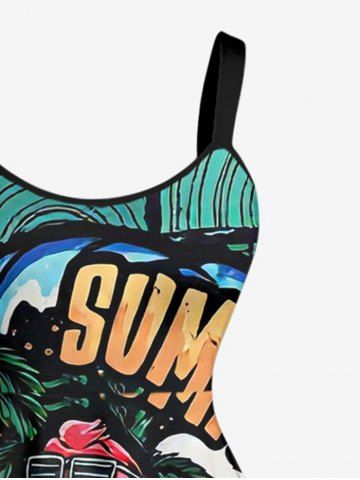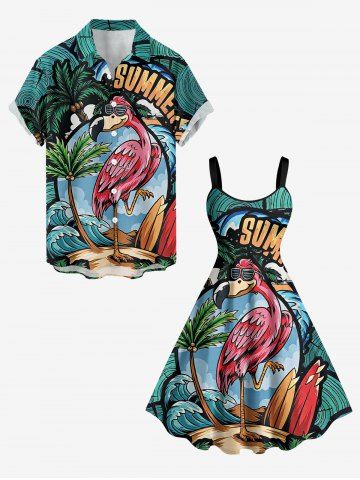 Robe trapèze hawaïenne grande taille à imprimé cocotiers, flamants roses et vagues - Vert Profond - M