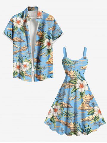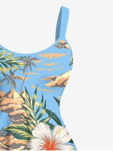 Robe trapèze hawaïenne grande taille à imprimé feuilles tropicales et fleurs d'hibiscus, motif cocotier et paysage marin - Bleu Clair - Bleu Clair