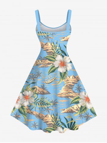 Robes Graphiques > Robe trapèze hawaïenne grande taille à imprimé feuilles tropicales et fleurs d'hibiscus, motif cocotier et paysage marin