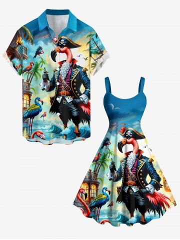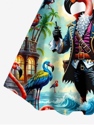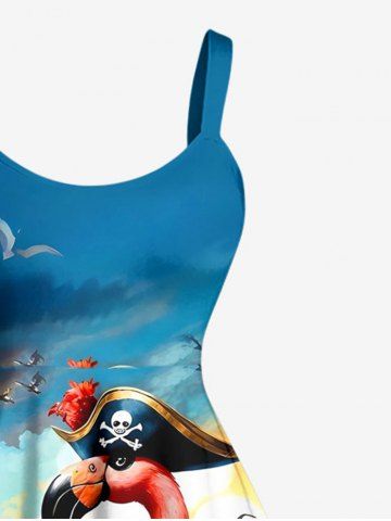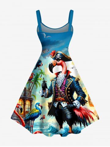 Robes Graphiques > Robe trapèze hawaïenne grande taille à imprimé flamants roses, pirates, cocotiers et vagues