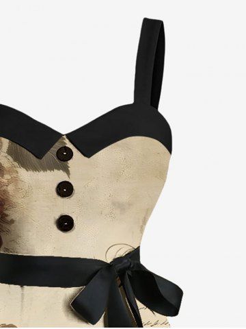 Robe trapèze hawaïenne grande taille à imprimé floral et feuilles de rose, effet vieilli, avec boutons et ceinture amovible - Café Lumière - 1x