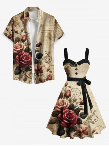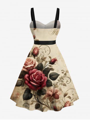 Robes Graphiques > Robe trapèze hawaïenne grande taille à imprimé floral et feuilles de rose, effet vieilli, avec boutons et ceinture amovible