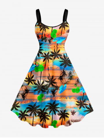 Robes Graphiques > Robe trapèze hawaïenne grande taille imprimée cocotiers, nuages et coucher de soleil ombré