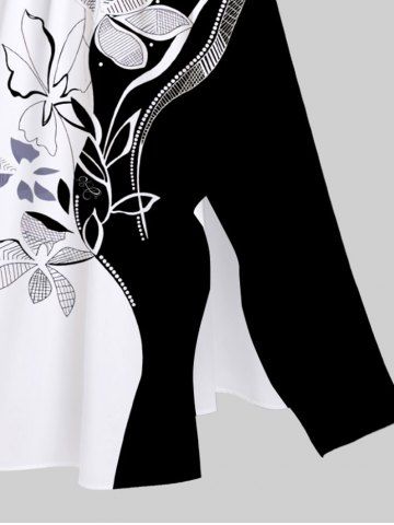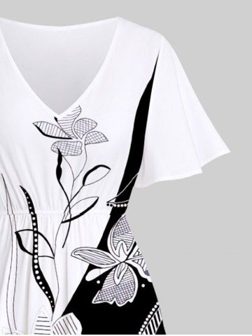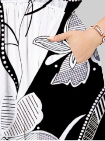 Robes Graphiques > Robe Trapèze Midi Imprimé à Feuilles et Fleurs avec Poche à Deux Tons Grande Taille