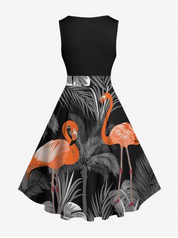 Robe trapèze vintage hawaïenne à imprimé flamants roses et feuilles tropicales, grande taille, cocotier - Noir - Noir