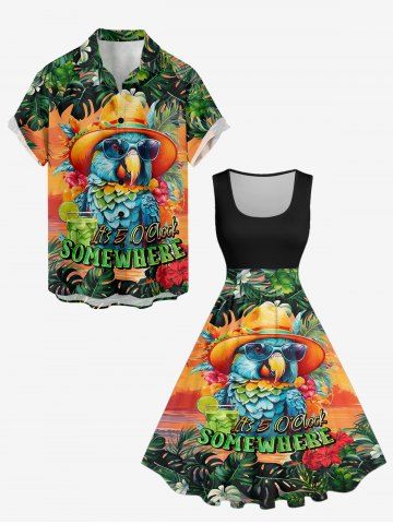 Robes Graphiques > Robe vintage grande taille à imprimé perroquet, jus de fruits, fleurs et feuilles tropicales, style hawaïen des années 1950