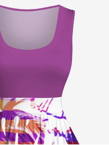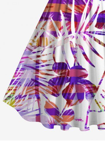 Robe Vintage Trapèze Rayée Contrastée Arbre Noix de Coco Fleurie Imprimé Grande Taille - Pourpre - Pourpre