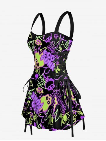 Robes Graphiques> Skulls Rock and Roll Print Hawaii Lace Up A Line Dress