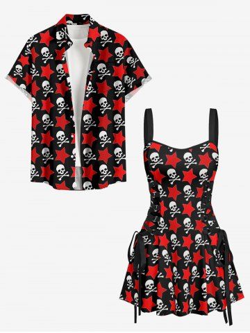 Skulls Star Print Lace Up A Line Dress - Rouge - Rouge