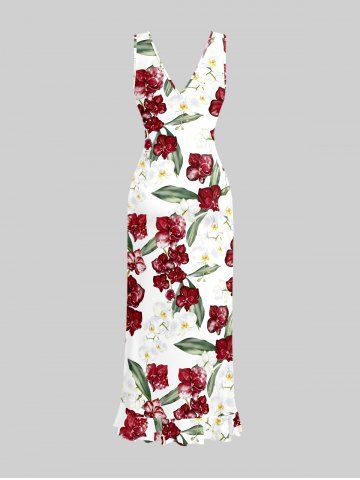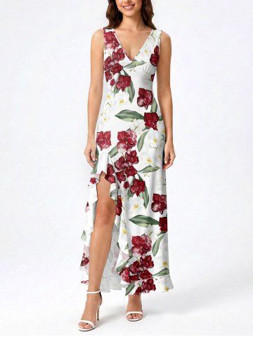 Robes Graphiques > Tropical Leaf Flower Print Hawaii Ruffles Split Dress