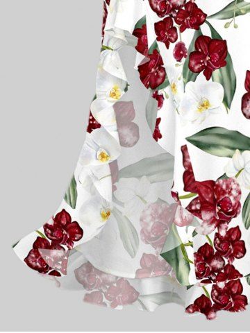 Tropical Leaf Flower Print Hawaii Ruffles Split Dress - Rouge Foncé - L