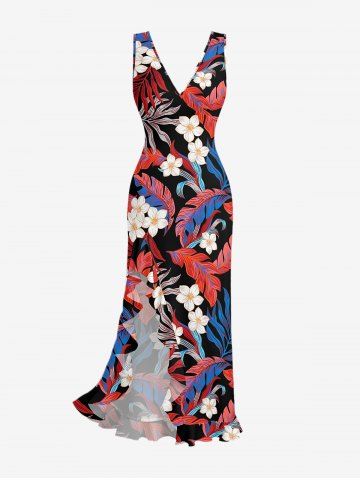 Robes Graphiques> Tropical Leaf Flower Print Hawaii Ruffles Split Dress